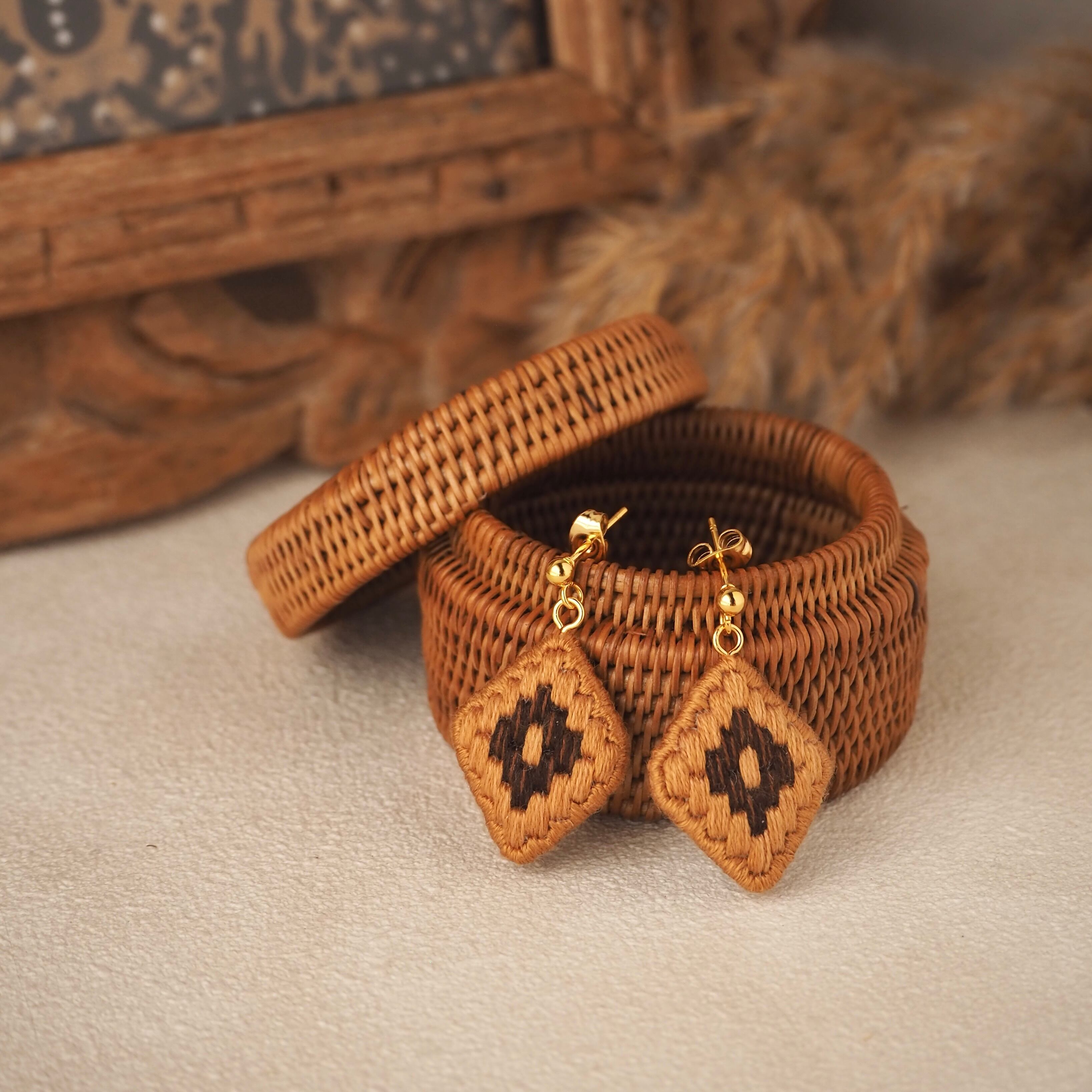 「アタモチーフ」の刺繍は、そんなアタの魅力を細部まで刺繍で再現したシリーズです。ひと針ひと針編み目模様まで再現し、まるでミニチュアのアタかごを身につけているようなデザインになっています。