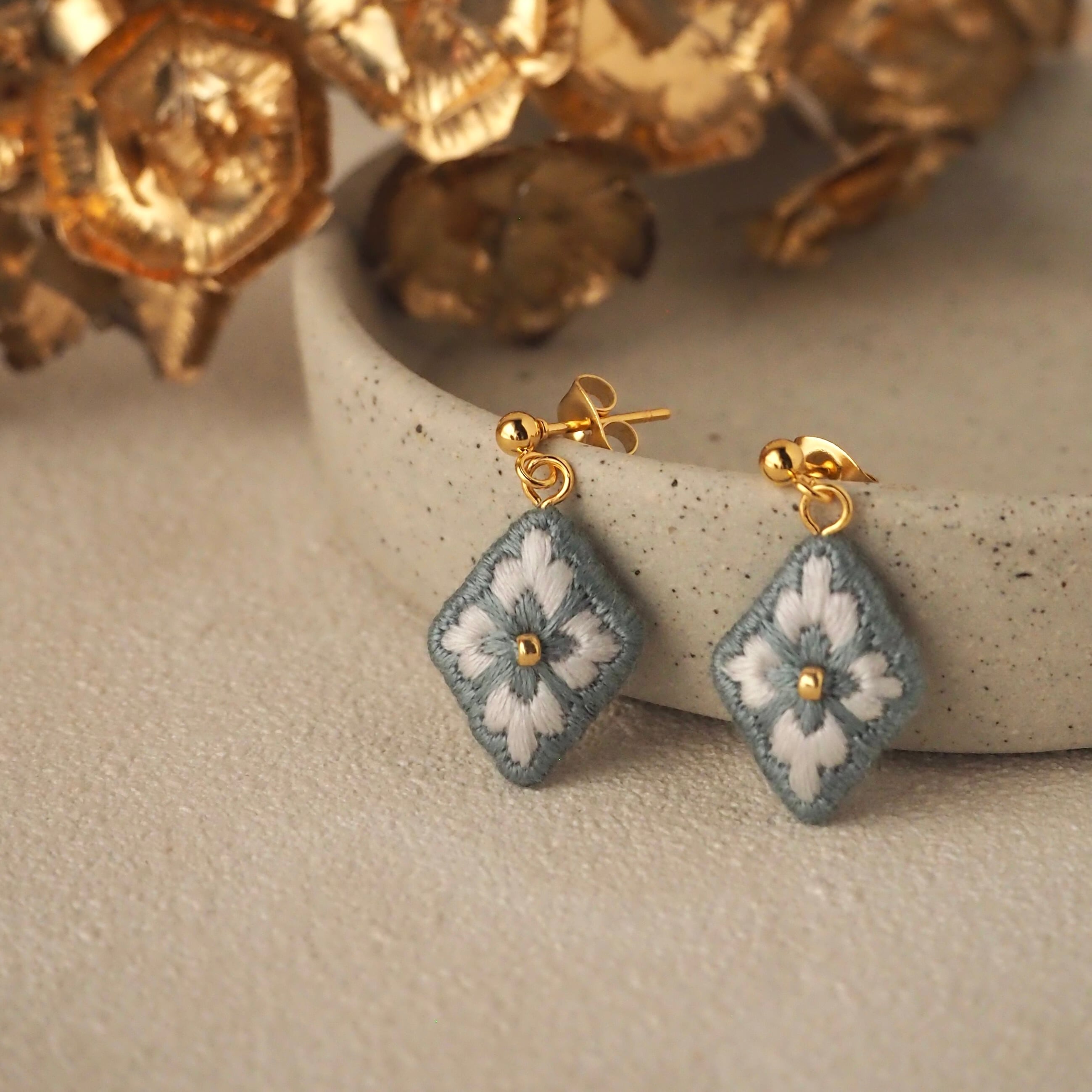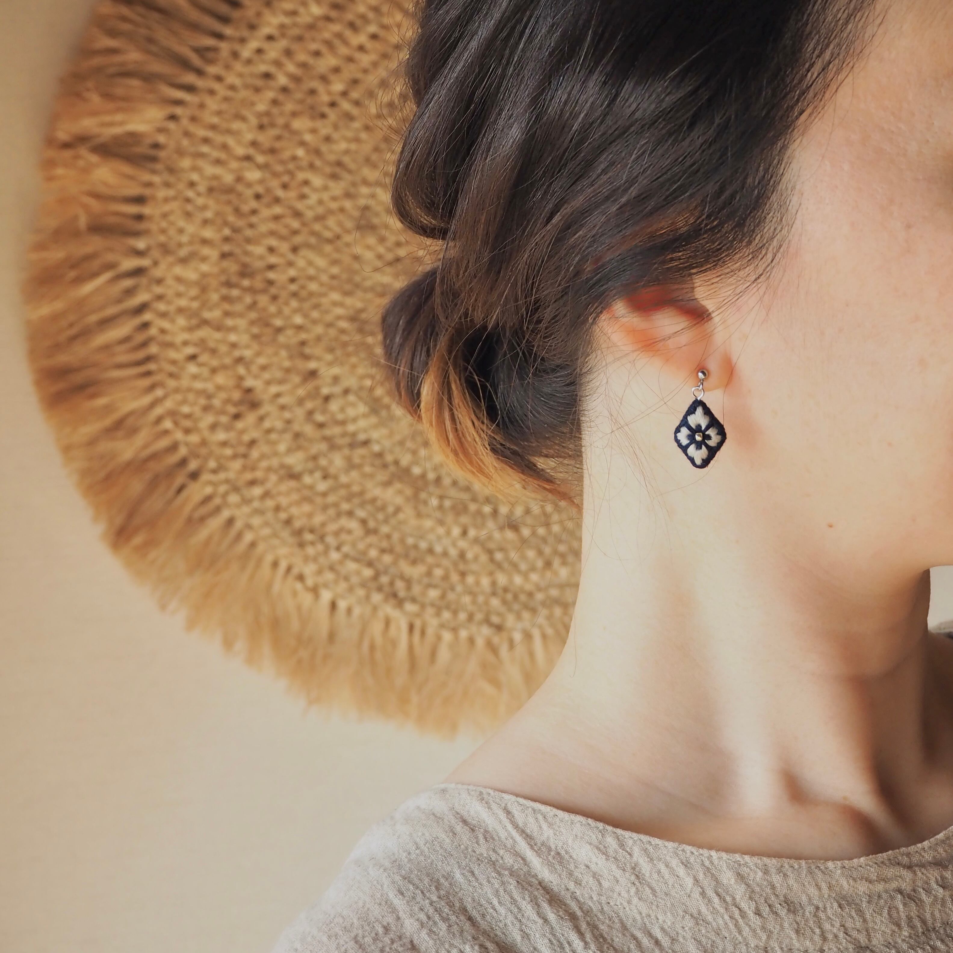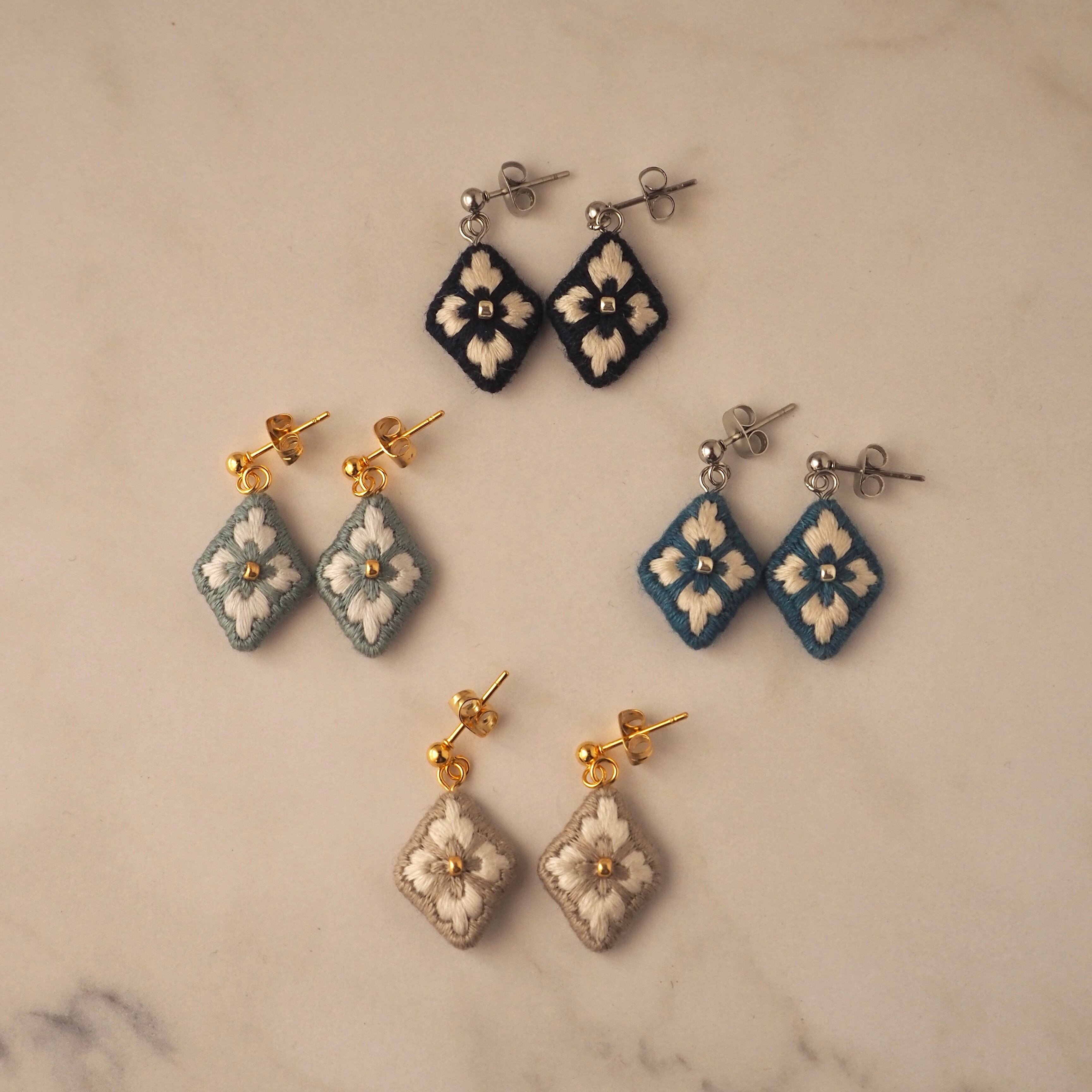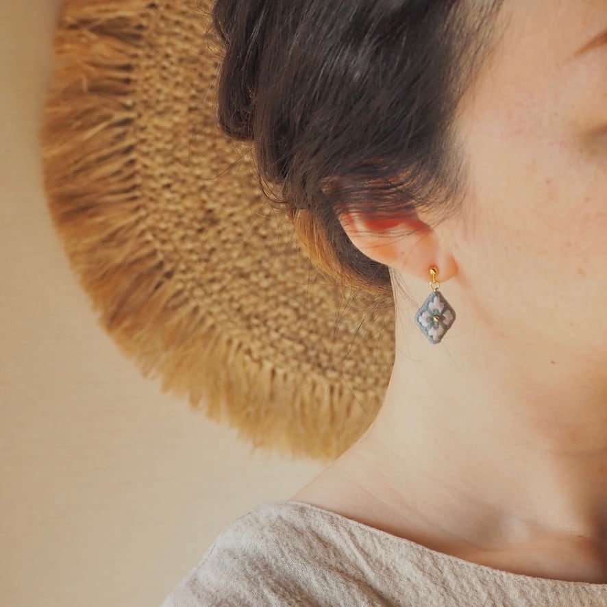 石や金属とはまた違った、糸ならではの柔らかなツヤがあり、いつもの装いをちょっぴり上品にしてくれる刺繍ピアスです。