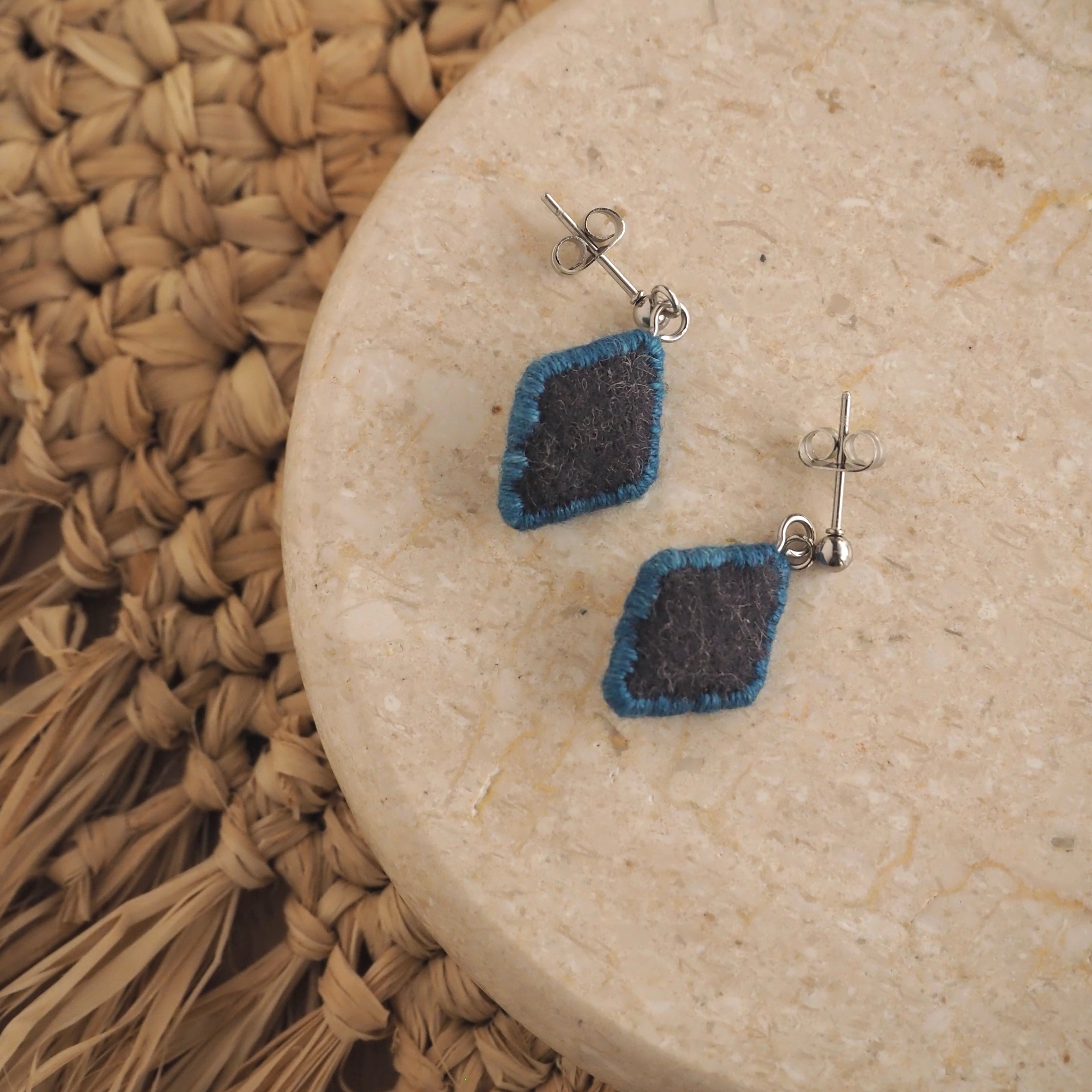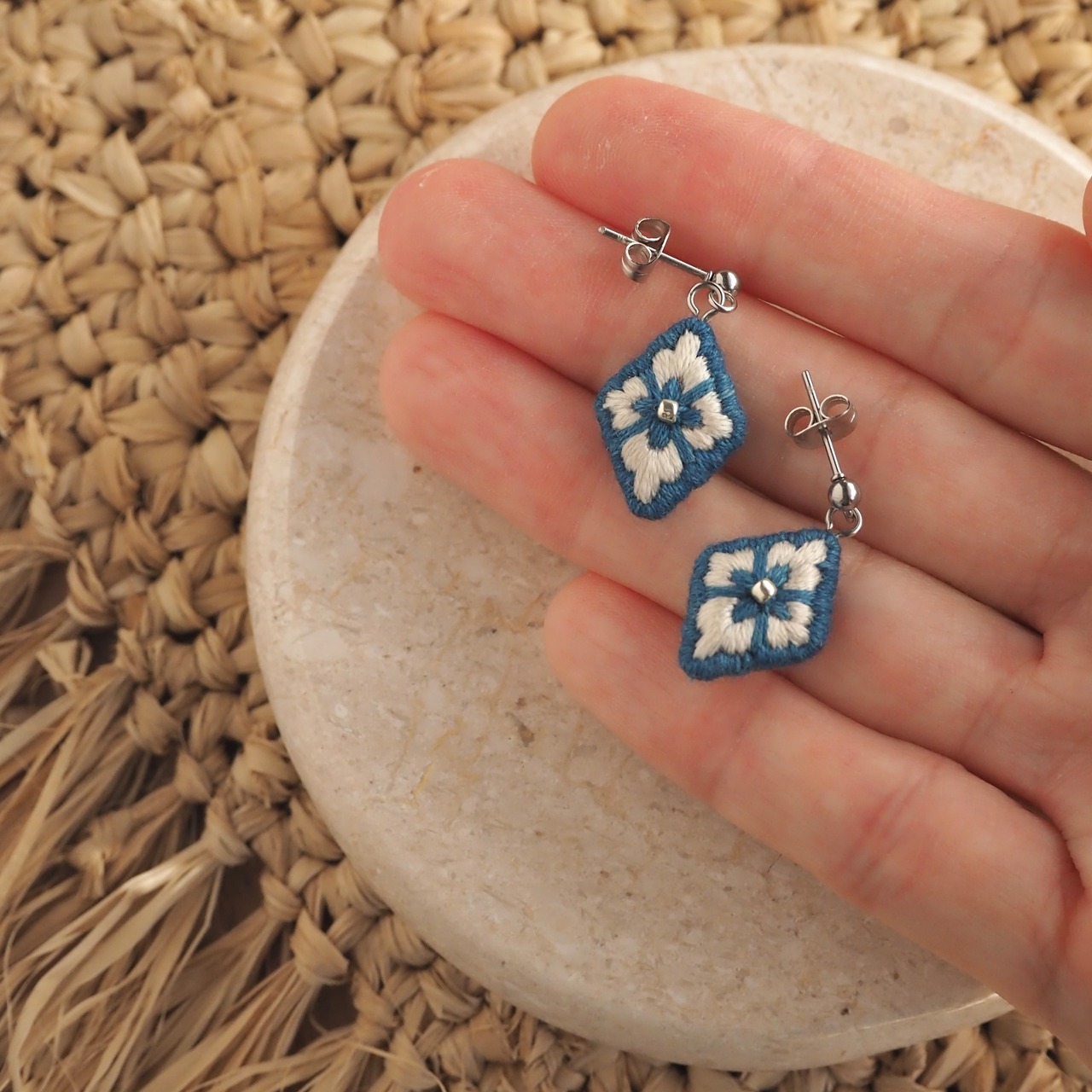 この刺繍の耳飾りは、刺繍糸1本を引き抜いた1本取りで刺繍をしています。